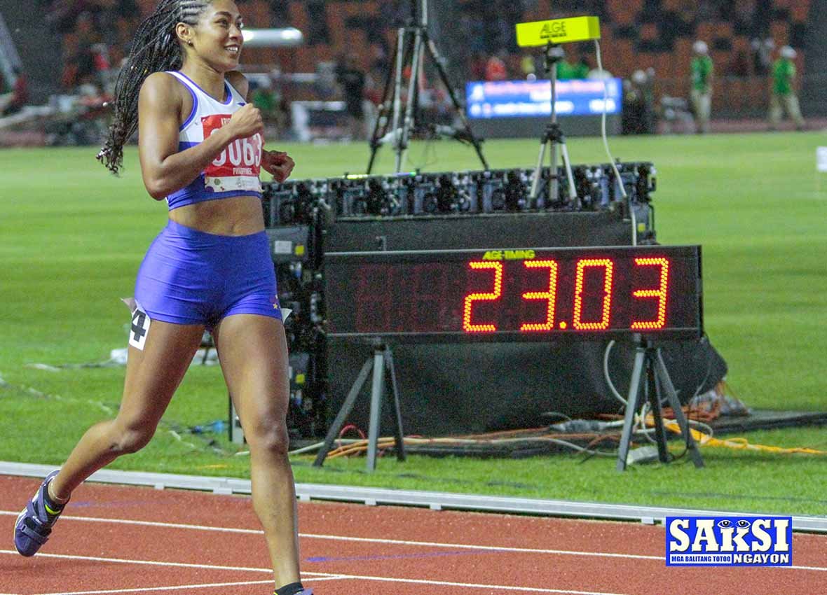Nagrehistro ng 23.07 segundo sa 200m dash ang Orlando, Florida based na bagong sprint queen ng biennial meet, higit na mabilis sa 18-taong SEA Games record na 23.30 segundong record ni Supavadee Khawpeag ng Thailand noong 2001 SEA Games sa Kuala Lumpur.