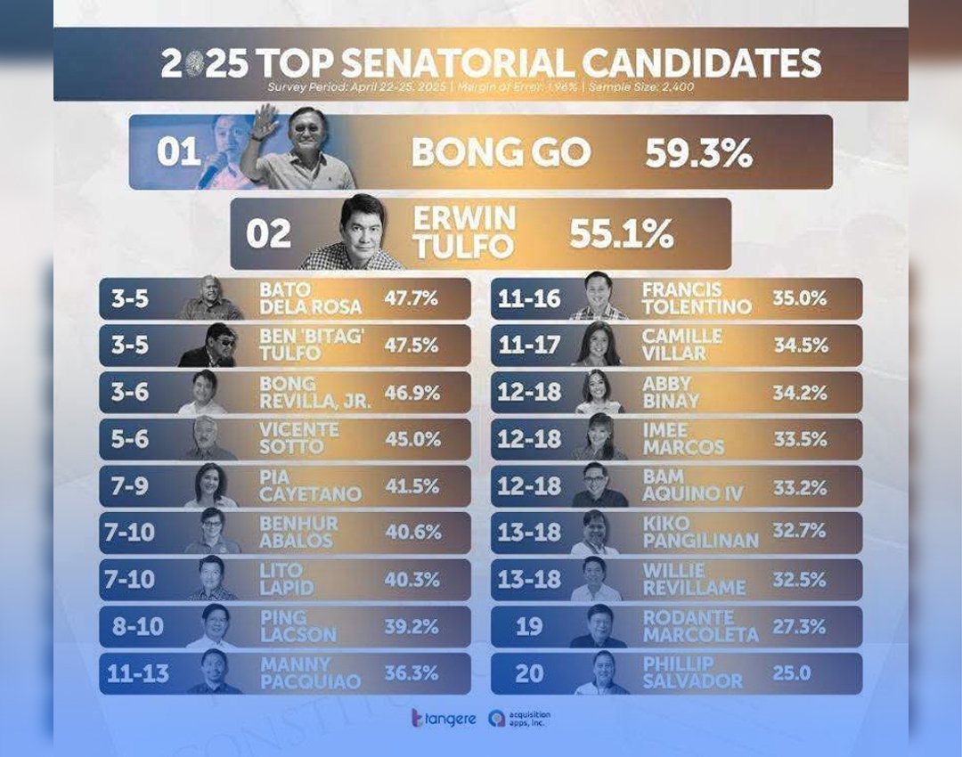 INILATHALA ng Tangere ang pinakahuling top 20 Senatorial Survey result na isinagawa nito sa mga petsang Abril 22-25.