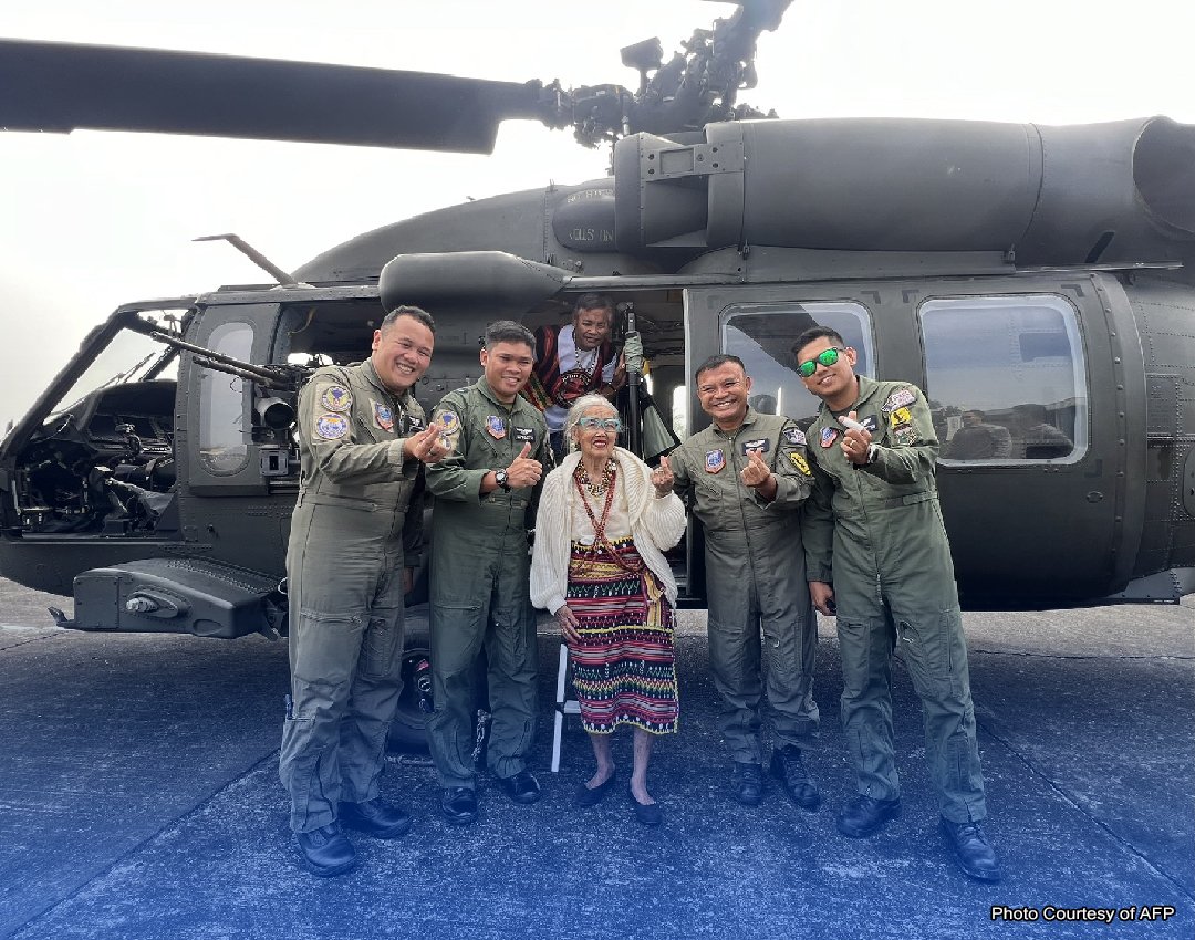 SA isang makasaysayang pagkakataon, isinakay ng Philippine Air Force sa kanilang PAF Blackhawk Helicopter si Apo Whang-Od, ang legendary tattoo artist ng Pilipinas, para makaharap si President Ferdinand Marcos Jr. sa Malacañang.