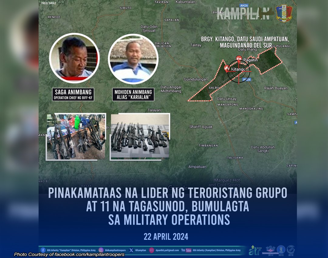 Bukod sa napaslang na mga terorista, nabawi rin ng mga tauhan ng 1st Brigade Combat Team ang 12 high powered firearms matapos nilang makasagupa ang 15 kasapi ng Bangsamoro Islamic Freedom Fighters-Karialan Faction (BIFF-KF), na pinamumunuan ni alyas “Karialan”, sa Sitio Pendililang, Barangay Kitango, Datu Saudi Ampatuan, Maguindanao del Sur kamakalawa.