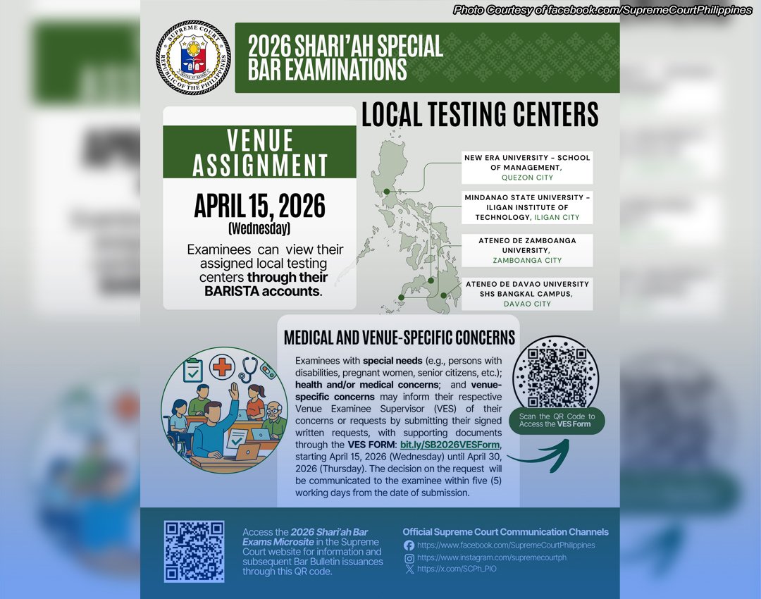 Itinakda naman ang 2026 Shariah Special Bar Exams sa darating na Mayo 24 at Mayo 27, 2026.