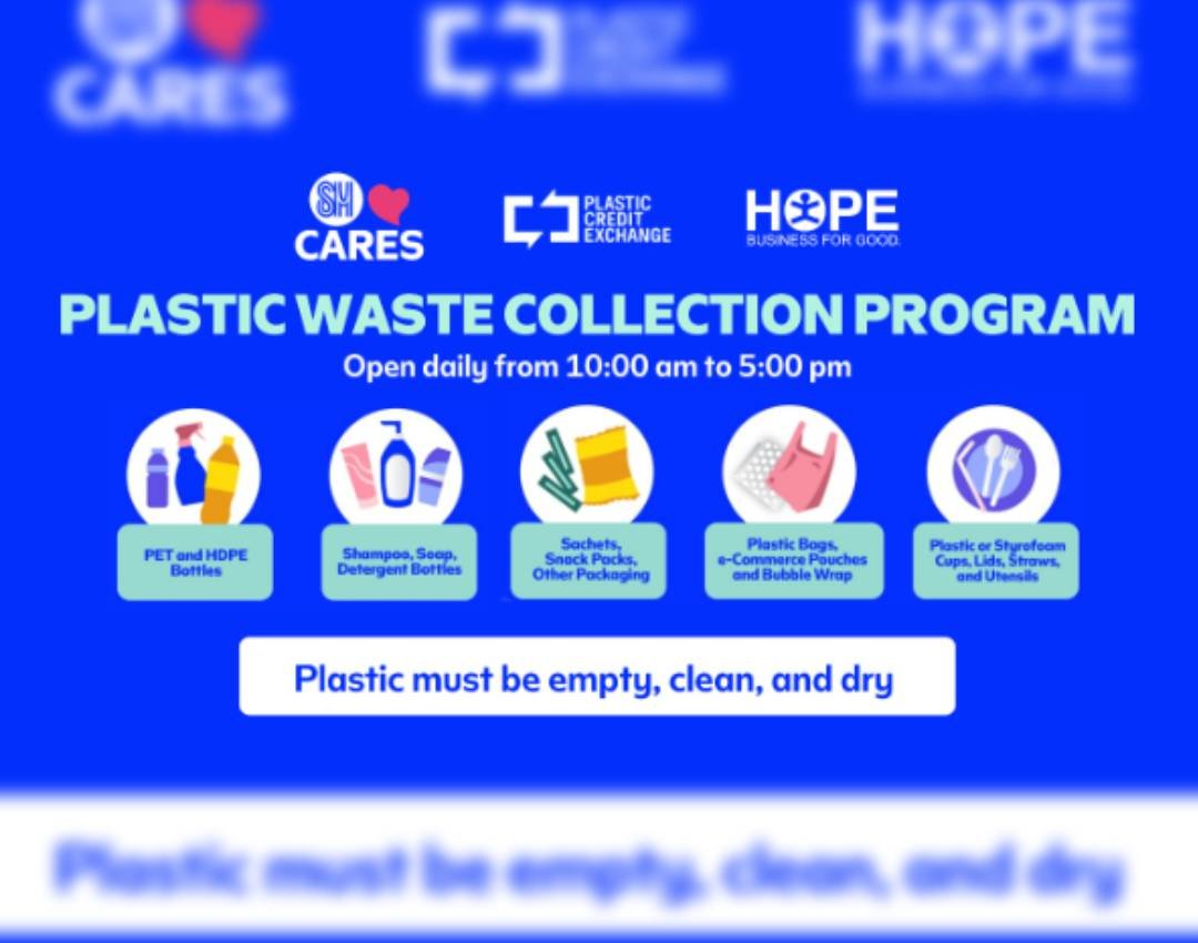 Anu-anong klase ng plastik ang maaaring dalhin sa SM? Ang mga plastik na yari sa PET at HDPE, mga bote ng shampoo, bote ng sabong panligo at panlaba, mga pambalot ng pinamili online, mga sachet at pakete, styrofoam, istraw, at mga plastik na kutsara’t tinidor.