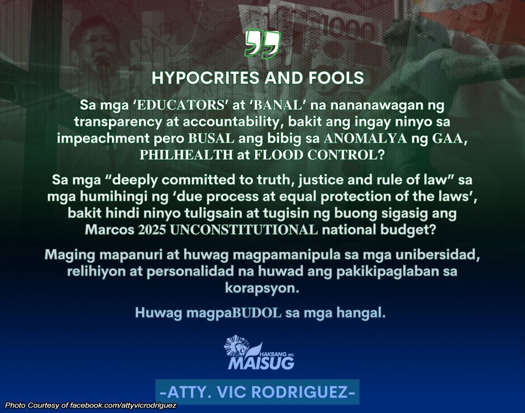 “Sa mga ‘𝐄𝐃𝐔𝐂𝐀𝐓𝐎𝐑𝐒’ at ‘𝐁𝐀𝐍𝐀𝐋’ na nananawagan ng transparency at accountability, bakit ang ingay ninyo sa impeachment pero 𝐁𝐔𝐒𝐀𝐋 ang bibig sa 𝐀𝐍𝐎𝐌𝐀𝐋𝐘𝐀 ng 𝐆𝐀𝐀, 𝐏𝐇𝐈𝐋𝐇𝐄𝐀𝐋𝐓𝐇 at 𝐅𝐋𝐎𝐎𝐃 𝐂𝐎𝐍𝐓𝐑𝐎𝐋? tanong niya.