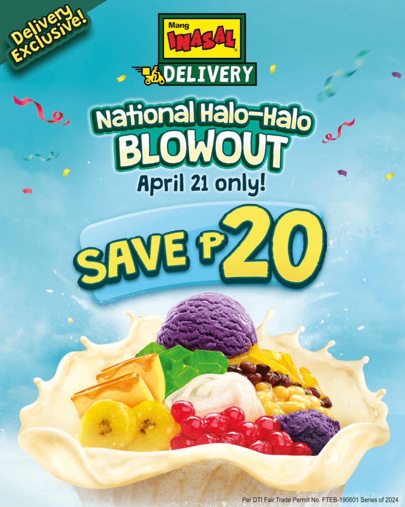 The National Halo-Halo Blowout’s ₱20 off on April 14 was available for dine-in and takeout transactions only. A delivery edition is coming up on April 21 offering the same ₱20 discount for orders of Mang Inasal Extra Creamy Halo-Halo Small Size made via Mang Inasal Delivery App, www.manginasaldelivery.com.ph, and other delivery channels.