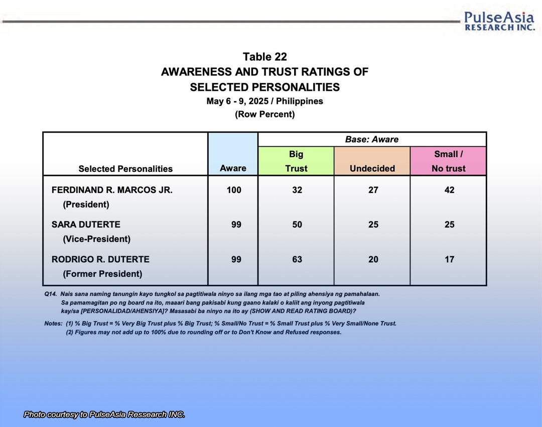 Samantala, bumaba naman ng 7% ang trust rating kay Vice President Sara Duterte. Kung dati ay nasa 57% ito noong Abril, 50% na lang ito ngayong buwan.