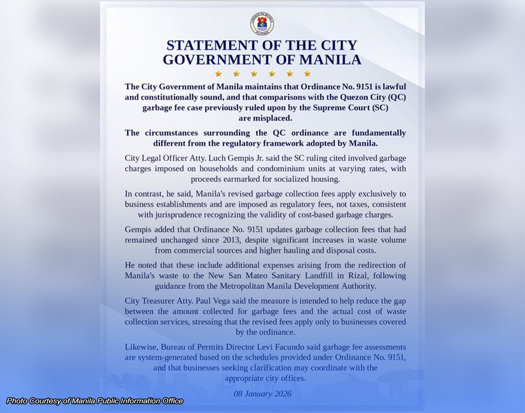 Sinabi rin ni Bureau of Permits Director Levi Facundo na ang pagtatasa ng garbage fees ay awtomatikong ibinabatay sa iskedyul na itinakda sa Ordinansa Blg. 9151. Payo niya sa mga negosyong may katanungan na makipag-ugnayan sa mga kinauukulang tanggapan ng lungsod para sa malinaw na paliwanag.
