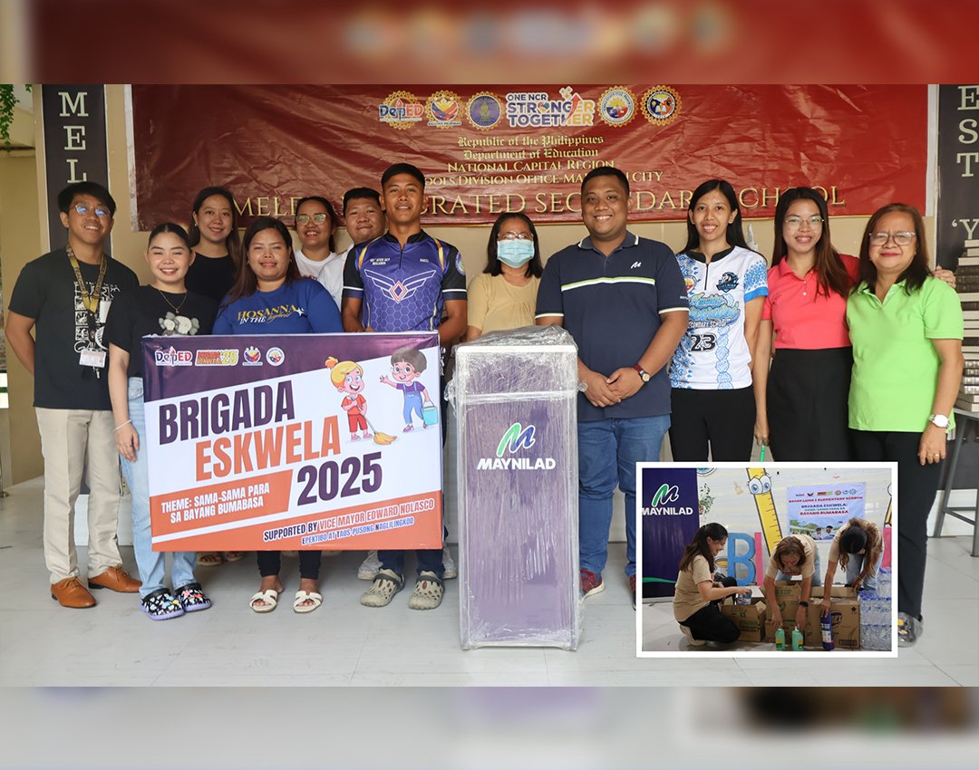In support of the Department of Education’s Brigada Eskwela 2025, Maynilad donated cleaning supplies and provided hydration support to around 50 public schools across its concession area. In the photo, faculty members of Imelda Integrated Secondary School in Malabon City receive a refrigerated drinking fountain from Maynilad. INSET: Teachers from Bayan Luma 1 Elementary School in Imus City unpack cleaning materials donated by Maynilad.