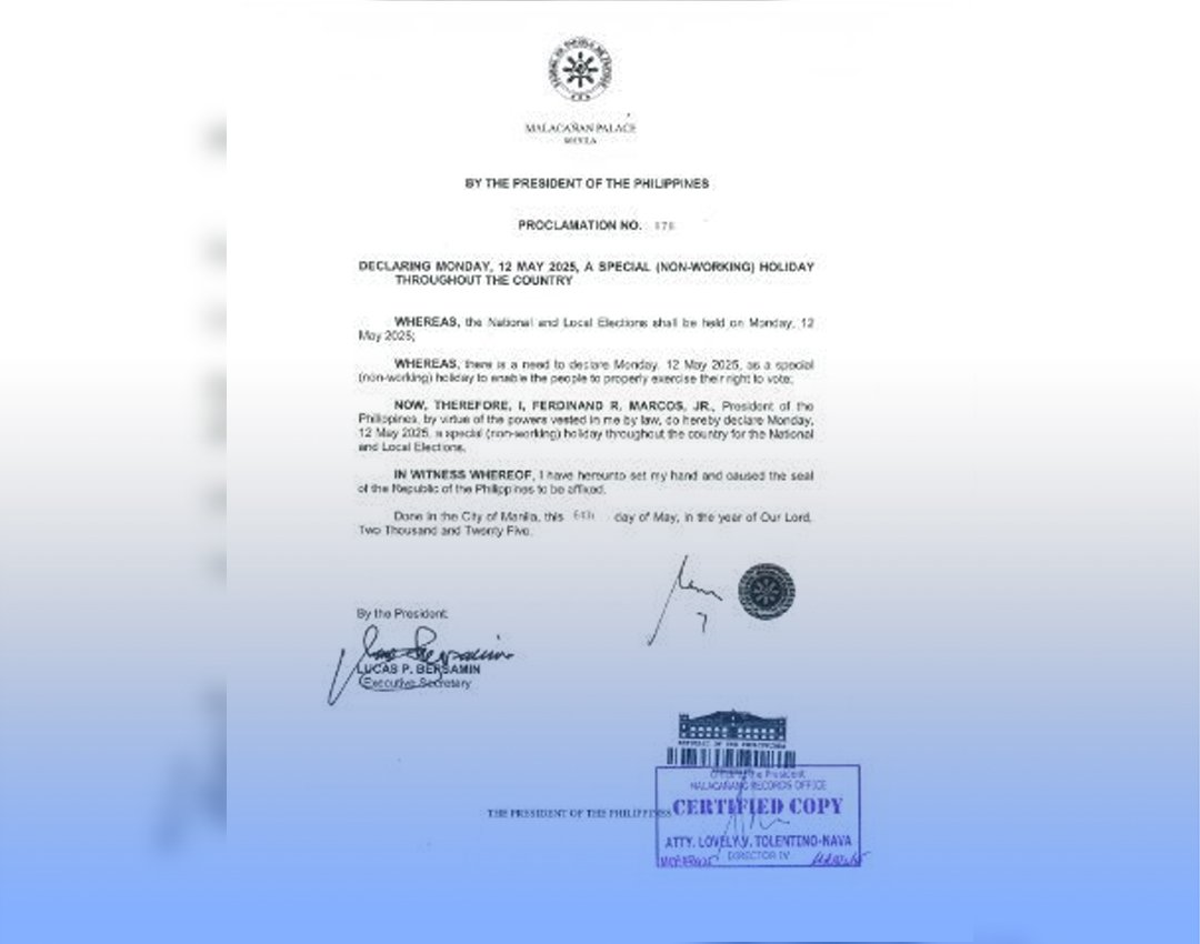 OPISYAL nang idineklara ni Pangulong Ferdinand Marcos Jr., na Special (Non-Working) Holiday sa buong bansa ang May 12, araw ng halalan.