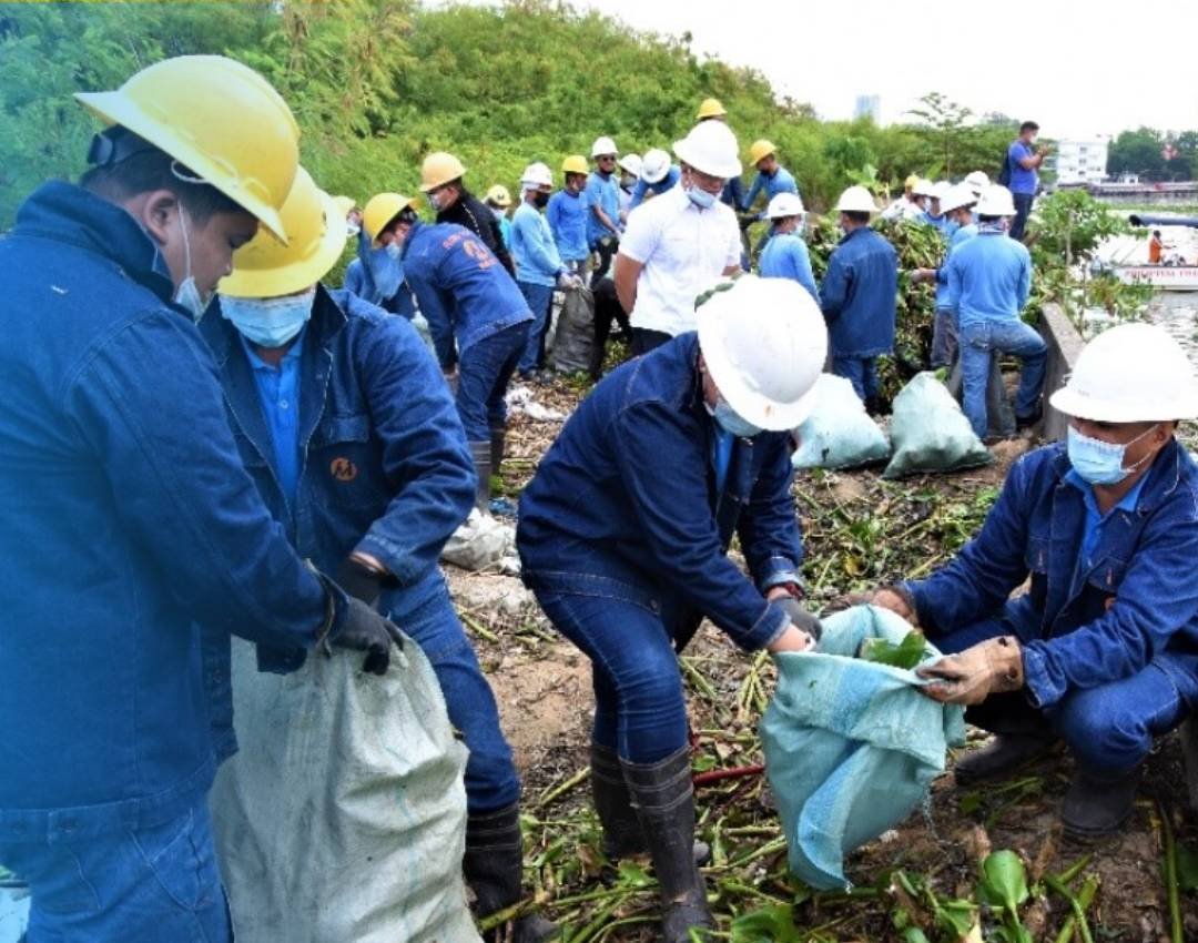 Kita sa larawan ang ilang mga Meralco employee-volunteers habang tinatanggal ang mga tumubong water hyacinth sa paligid ng Ilog Pasig na malapit sa Isla de Provisor sa Maynila