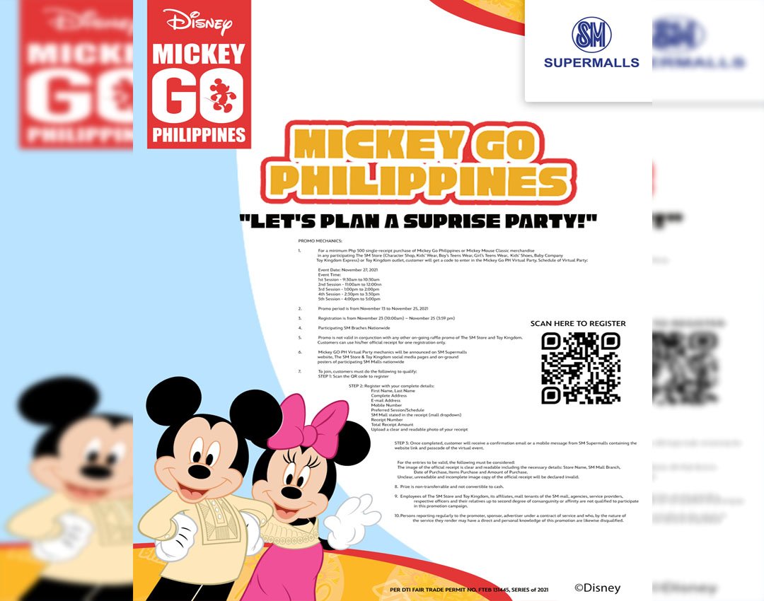Join Mickey & Minnie’s first virtual surprise birthday party! After you’ve shopped to your heart’s content during the live-selling events on Facebook, or at participating SM Store branches, you will automatically get a code to enter the virtual surprise birthday party on November 27. All you need is a minimum of PHP 500 single-receipt purchase of Mickey Go PH or Mickey Mouse Classic merchandise in any participating The SM Store (Character Shop, Kids’ Wear, Boy’s Teens Wear, Girl’s Teens Wear, Kids’ Shoes, Baby Company & Toy Kingdom Express) or Toy Kingdom outlet.