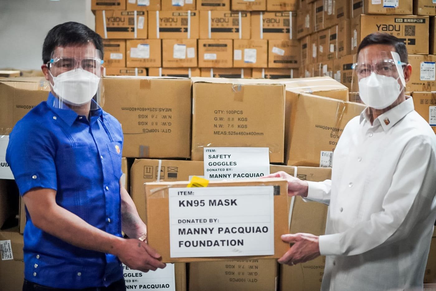 Sa isang simpleng turn-over ceremony sa Camp Aguinaldo, pormal na ibinigay ni Pacquiao sa DOH ang 299 piraso na pressure airway point unit na ginagamit upang makatulong sa paghinga ang mga pasyenteng may covid; 29,750 piraso na Personal Protective Equipment (PPE); 84,700 medical goggles; 241,000 face masks at 200 pirasong thermometer.