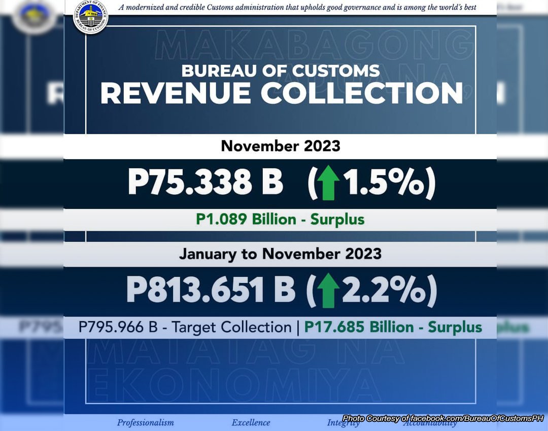 Mula Enero hanggang Nobyembre 2023, ang BOC ay nakalagpas sa kanilang revenue goal, na umabot sa halagang P813.651 bilyon na nalagpasan ang kanilang target na P795.966 bilyon sa pamamagitan ng 2.2%, o katumbas na P17.685 bilyon.