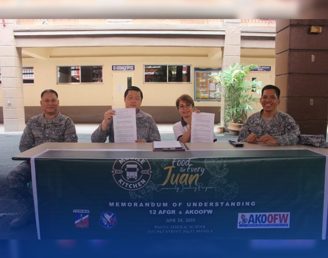Ang kasunduan ay ginanap sa Paco Catholic High School nitong Sabado, Hunyo 24, na nilagdaan ni 12th AFGR Group Commander Lt.Col. Donald Patrick Lim at AKOOFW Inc. National President Marcia Gonzalez-Sadicon.