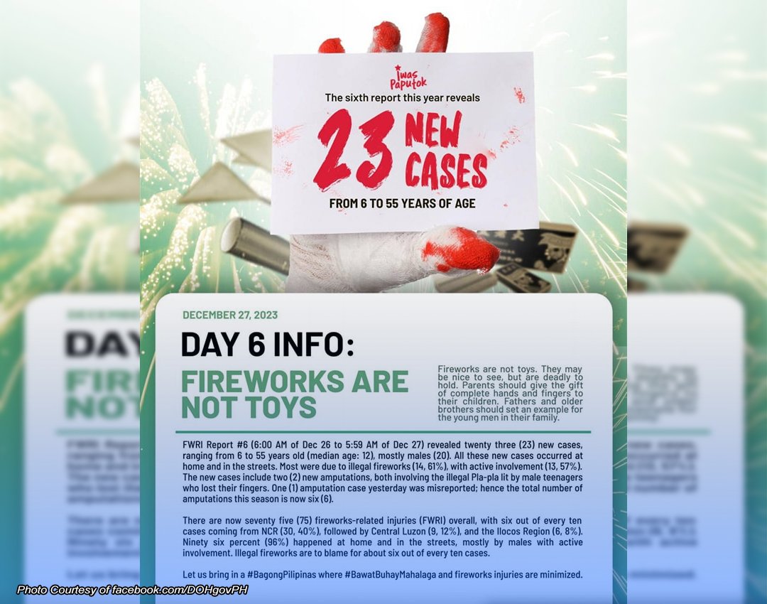 Iniulat din ng DOH nitong Disyembre 26, umaabot na sa 52 ang bilang ng mga nasugatan dahil sa paputok kung saan lima sa mga ito ay naputulan ng mga kamay o daliri. Tatlo sa mga biktima ay menor de edad at 2 adults na pawang lalaki na gumamit ng ilegal na boga, pla-pla, five-star, goodbye Philippines fireworks at whistle bomb.