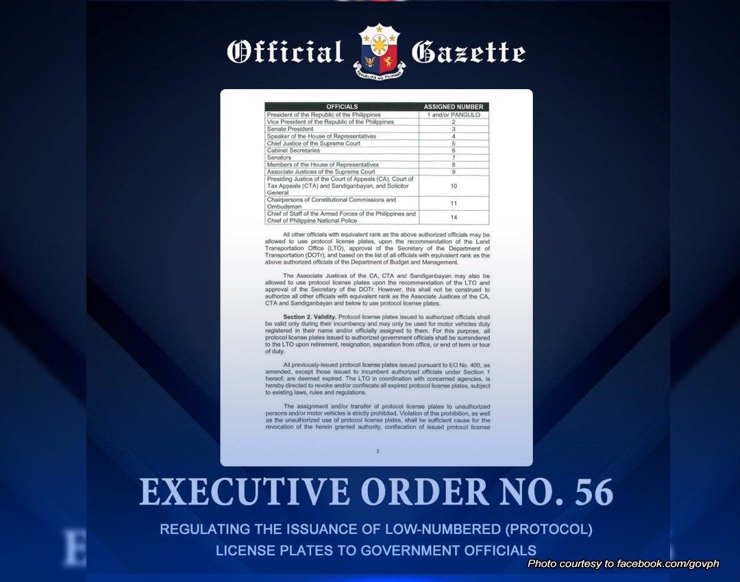 Nauna rito, nagpalabas ang Pangulo ng Executive Order (EO) No. 56, inamiyendahan ang EO No. 400 (s. 2005), na pinahihintulutan ang pagtatalaga at pagpapalabas ng low-numbered protocol license plates sa mga sasakyan na ginagamit ng mga opisyal ng pamahalaan.