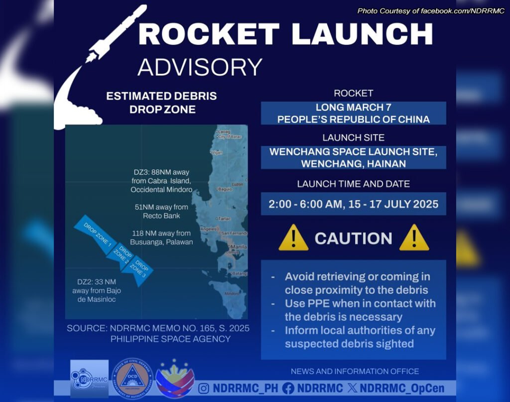 NAGLABAS ng babala ngayon sa publiko ang National Disaster Risk Reduction and Management Council (NDRRMC) sa posibleng pagbagsak ng rocket debris mula sa himpapawid sa bahagi ng Luzon dahil sa nakatakdang paglulunsad ng Long March 7 rocket ng China sa pagitan ng Hulyo 15 hanggang 17. Batay sa inilabas na abiso ng NDRRMC, ang posibleng maging drop zones ay sa bisinidad ng Cabra Island, Occidental Mindoro; Recto Bank; Busuanga, Palawan; at Bajo de Masinloc malapit sa Zambales. “The Chinese rocket will be launched from Wenchang Space Launch Site in Wenchang,…