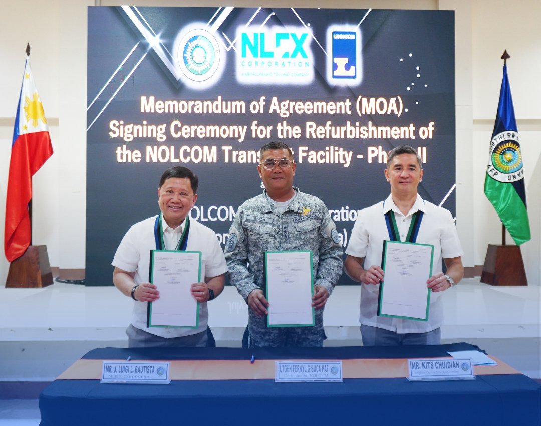 MOA SIGNING – (Mula sa kaliwa) Pinangunahan ni NLEX Corporation President and GM J. Luigi L. Bautista kasama sina NOLCOM Commander Lt Gen Fernyl G. Buca, PAF, at Leighton Contractors (Asia) Limited Country Manager and President Kits V. Chuidian ang isinagawang Memorandum Of Agreement (MOA) signing ceremony kamakailan para sa pagsasaayos ng NOLCOM Transient Facility- Phase II sa loob ng Camp General Servillano Aquino sa Tarlac City. (CONTRIBUTED PHOTO)