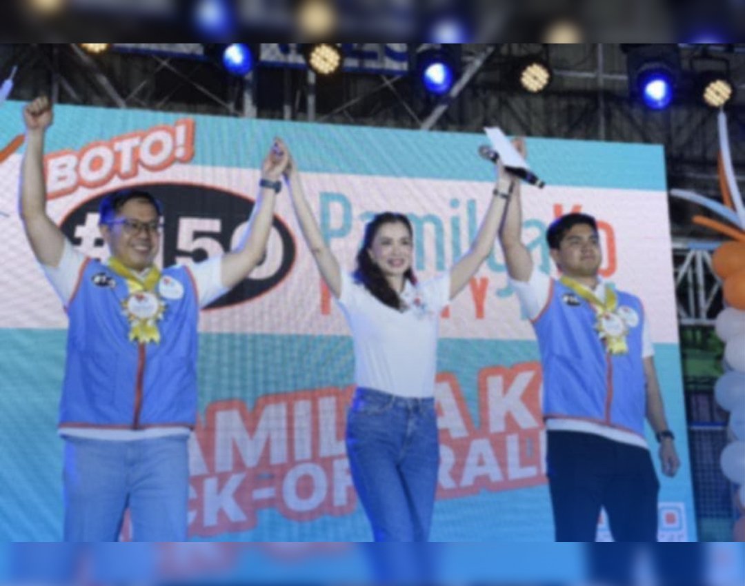 ITINAAS ni PAMILYA KO party-list #150 supporter Ms. Sunshine Cruz ang kamay nina nominees Atty. Anel Diaz at Miguel “Migz” Kallos sa kick off rally nito sa Tanay, Rizal.