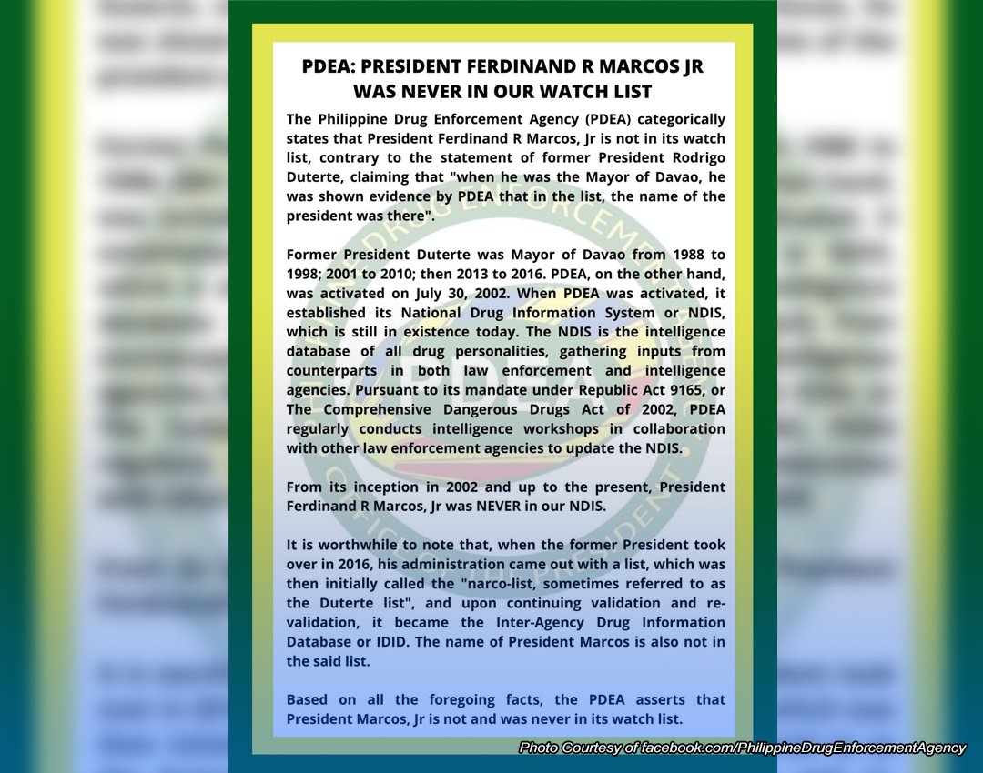 Kasunod ito ng naging pahayag ni dating Pangulong Rodrigo Duterte na noong alkalde pa lang siya ng Davao, may ipinakitang ebidensya ang PDEA kung saan nasa listahan ang pangalan ng kasalukuyang Pangulo.