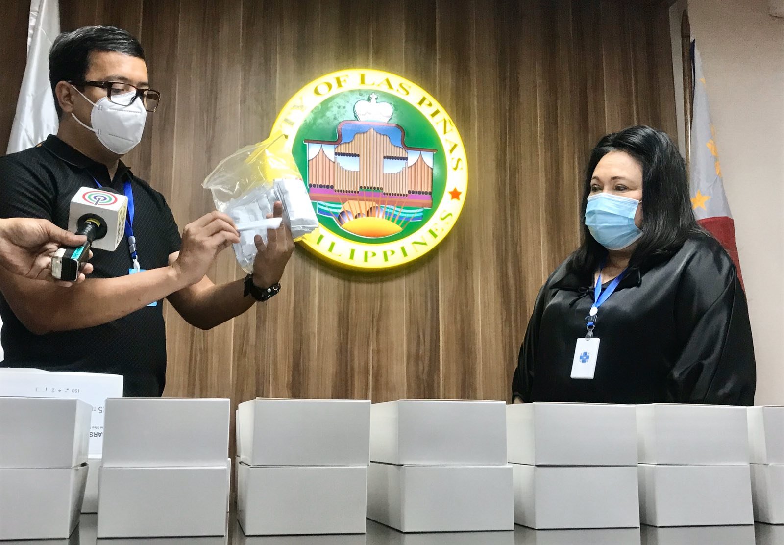 TEST KITS. Ipinakikita ni Rural Health Physician Dr. Julio Javier kasama si Las Piñas City Mayor Imelda Aguilar ang mga COVID-19 rapid test kits para sa mga healthcare Worker, frontliners at suspected COVID-19 cases na dumating sa nasabing lungsod.
