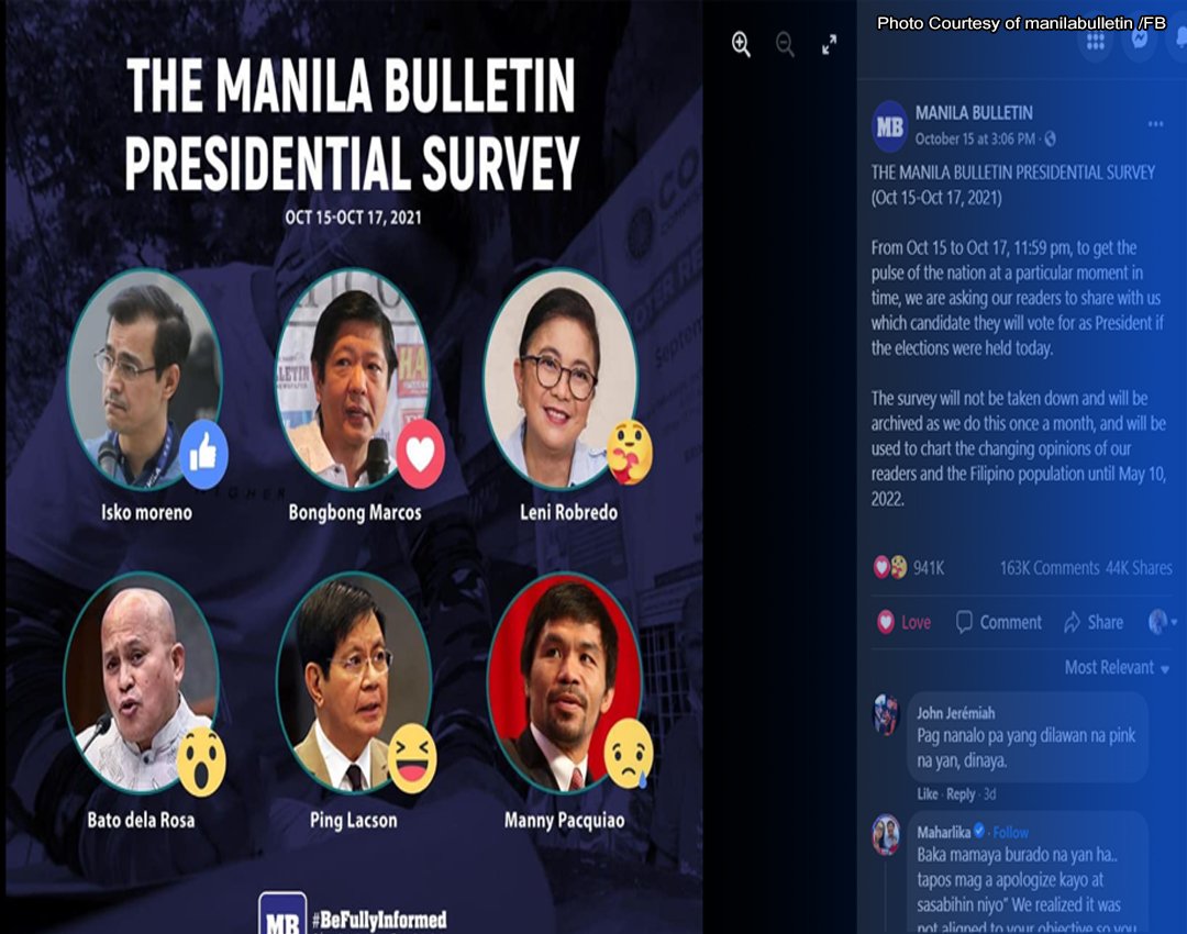 Sa artikulong nilathala ng Manila Bulletin nitong Lunes, lumalabas na 73% ng respondents ay pinili si Marcos bilang Presidente. Higit na mas malaki ito sa naitala ni Robredo na 24% na mga boto. Samantala, si Domagoso ay pumangatlo at sinundan ng mga senador na sina ‘Bato’ Dela Rosa, Manny Pacquiao and Ping Lacson.