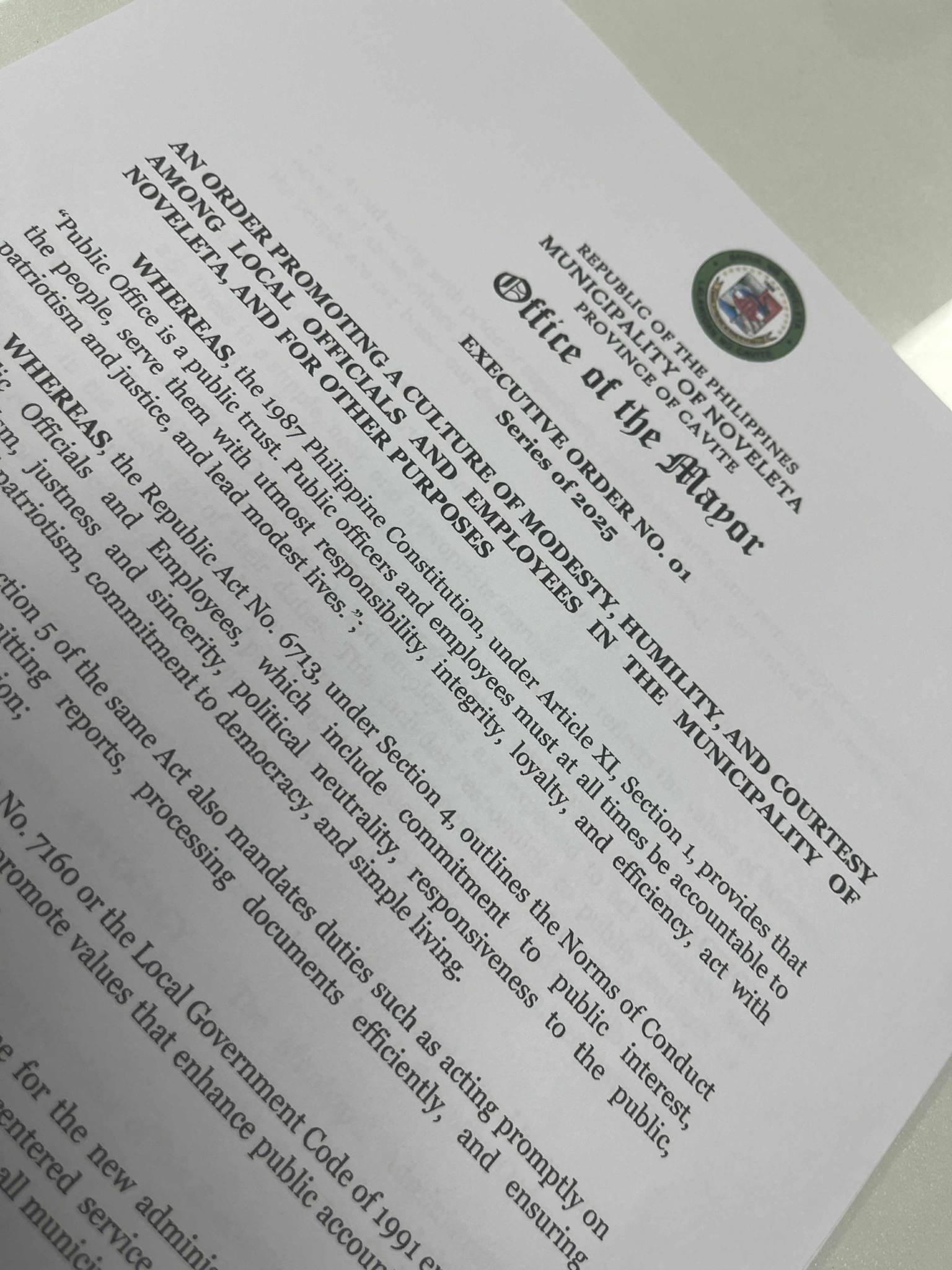 Ito ang kauna-unahang executive order ng bagong Mayor ng Noveleta na si Mayor Davey Reyes Chua.