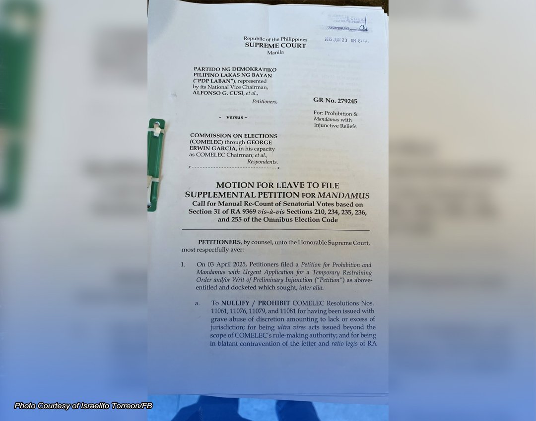 NAGHAIN ng karagdagang petisyon o supplemental petition sa Korte Suprema ang Partido ng Demokratiko Pilipino Lakas ng Bayan (PDP Laban) na ang layon ay atasan ng Kataas-taasang Hukuman ang Comelec na isalang sa manu-manong bilangan ang resulta ng senatorial elections nitong Mayo.