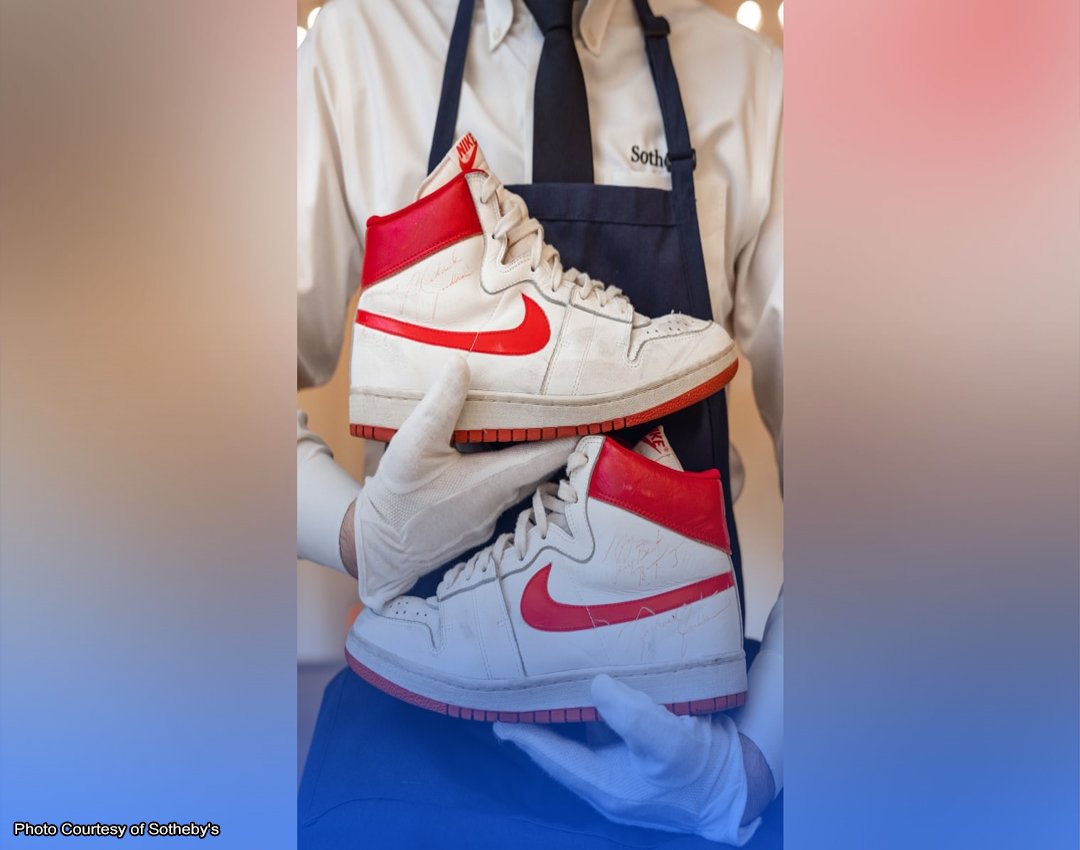 Ang sapatos na nabenta ng $615,000 (Air Jordan 1s) ay ginamit ni Jordan sa preseason exhibition sa Italy noong 1985, nang wasakin niya ang backboard matapos mag-dunk. May piraso pa ng salamin sa sole ng left shoe.