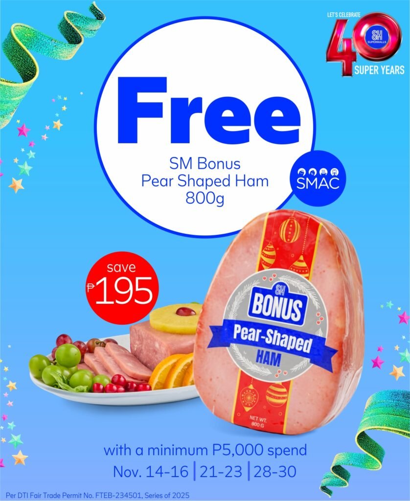 - Get free SM Bonus Pear Shaped Ham with a minimum P5,000 spend on November 14–16, 21–23, and 28–30