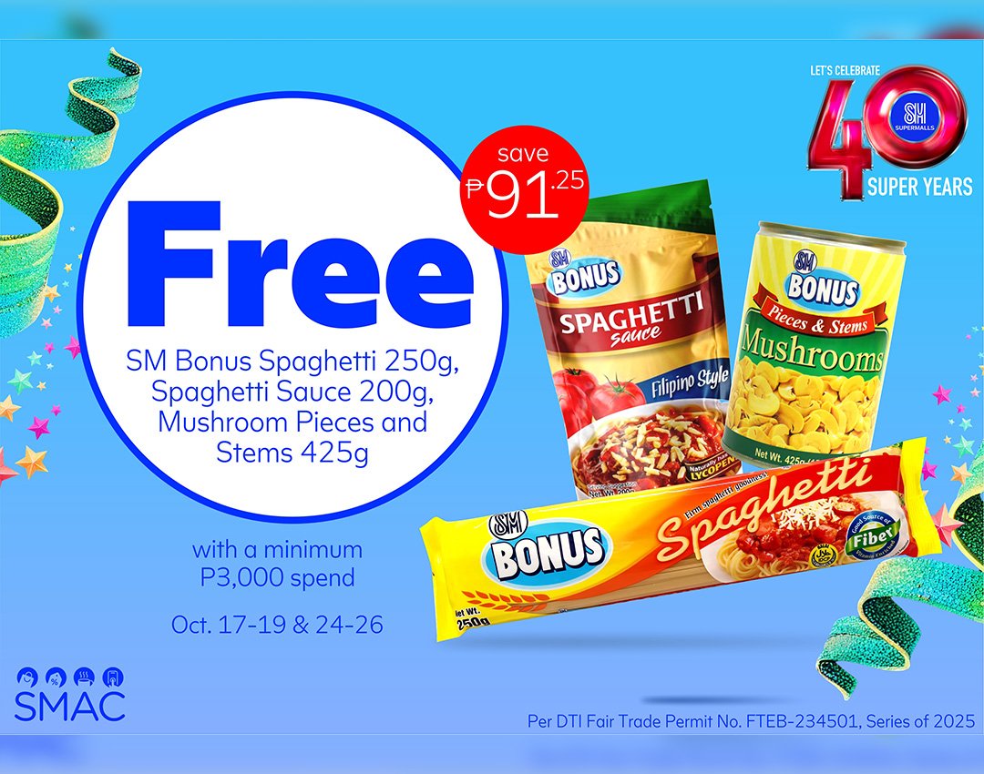 - Get a free bundled pack (SMB Spaghetti Pasta 250g, SMB Spaghetti Sauce 200g, SMB Mushroom 425g) with a minimum P3,000 spend on October 17–19 and 24–26