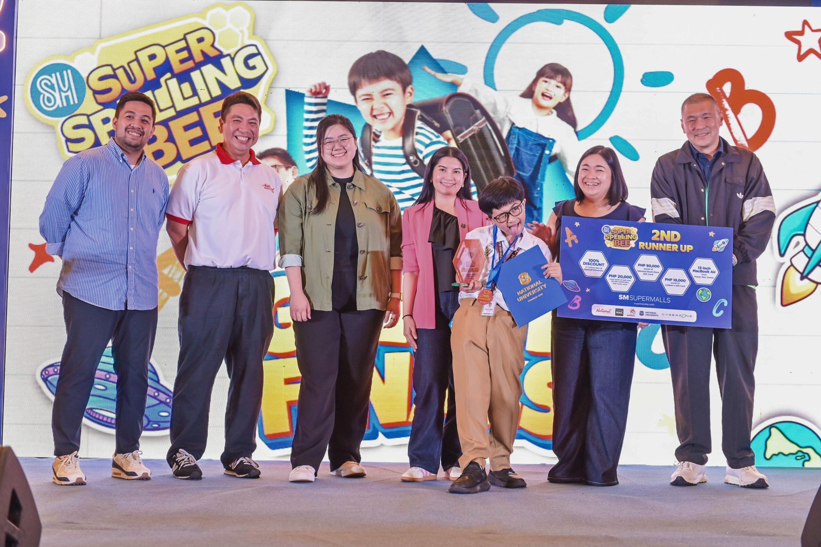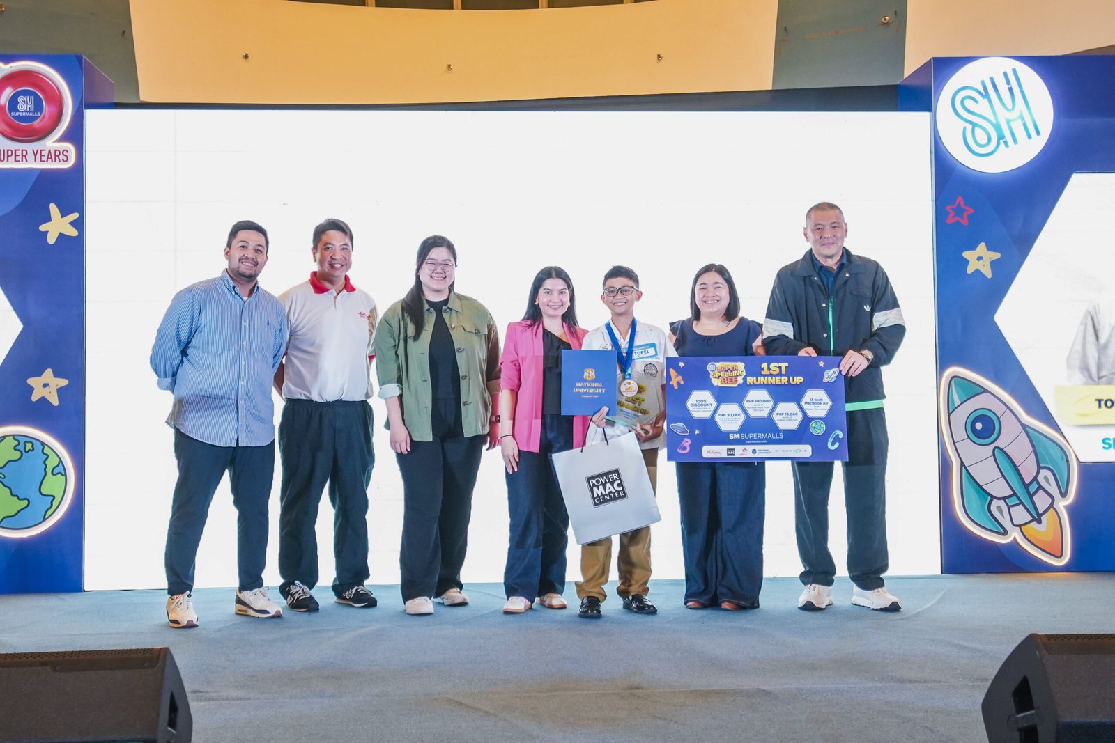 After three gruelling rounds, Jamver Mallari of SM City Legazpi was awarded the 2025 SM Super Spelling Bee grand winner. From left: Power Mac Center Assistant Marketing Manager Miguel Carpio, National Book Store President Adrian Ramos, SM Supermalls Assistant Vice President for Marketing and Leasing Hanna Carinna T. Sy, National University Senior Director for Business Development and Linkages Dr. Shainne Hostalero, Jamver Mallari, Power Mac Center Senior Business Development Manager Niña Rodriguez, and SM Supermalls Executive Vice President for Marketing Joaquin San Agustin.