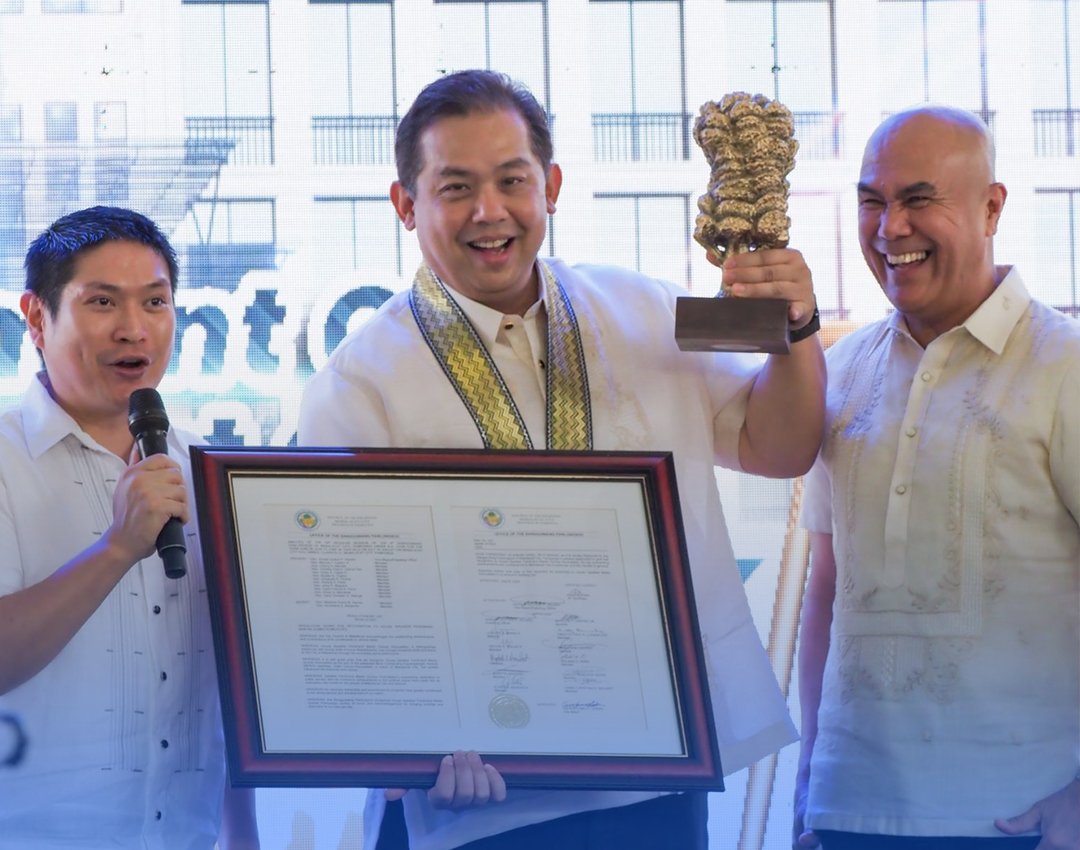 Speaker Ferdinand Martin G. Romualdez receives a memento and a copy of the resolution of the City Council of Mabalacat on Friday honoring him and giving due recognition to his exemplary achievements in public service which brought honor to the city, being the son of a native—the former Miss Juliette Gomez. Romualdez was the guest of honor and keynote speaker for the celebration of the 11th Anniversary of the Cityhood of Mabalacat and the groundbreaking for its New Government Center. With him are Mabalacat Mayor Crisostomo C. Garbo (right) and Vice Mayor Gerald Guttrie P. Aquino (left).