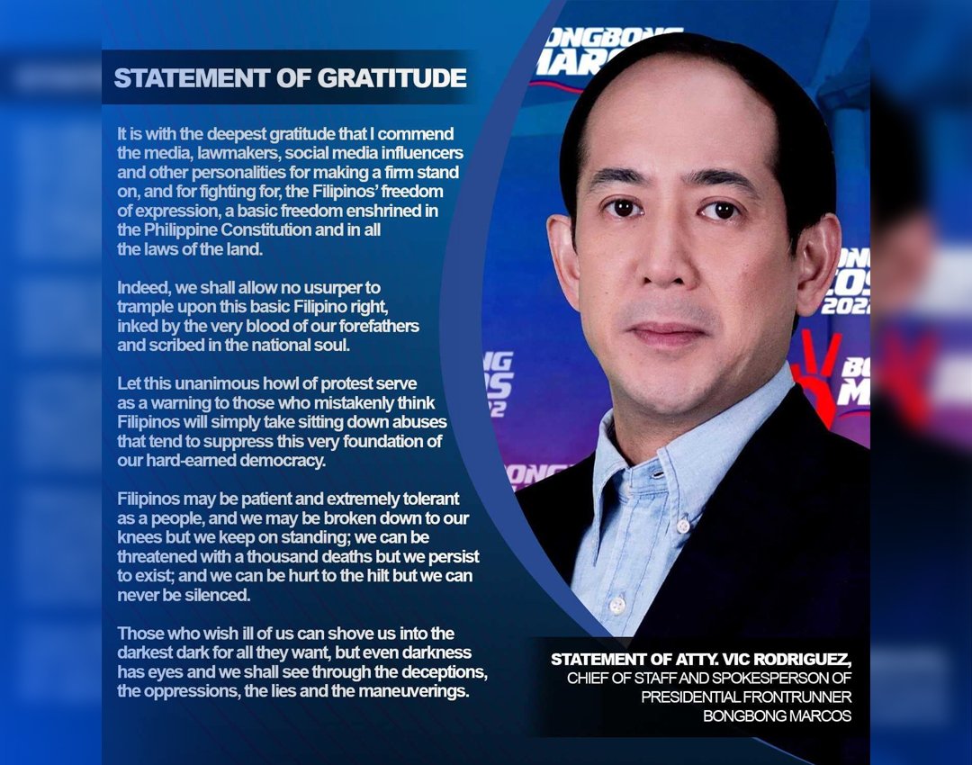 It is with great honor that I commend the media, lawmakers, social media influencers and other personalities for making a firm stand on, and for fighting for, the Filipinos’ freedom of expression, a basic freedom enshrined in the Philippine Constitution and in all the laws of the land.