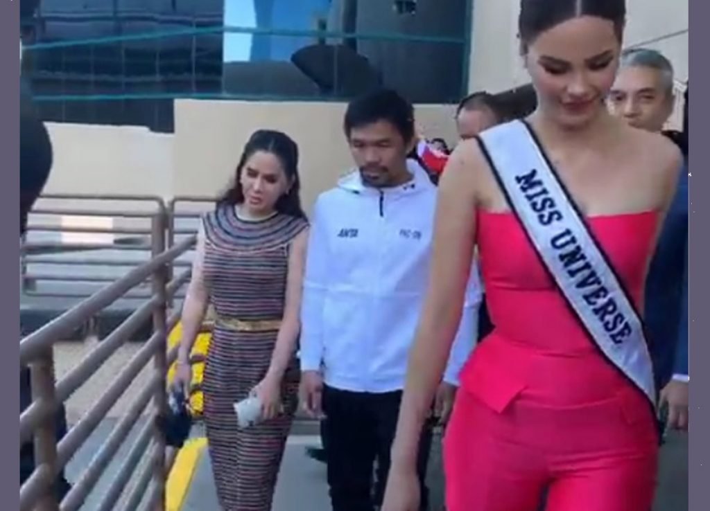 LAS VEGAS– Bukod sa kanyang reyna, ang misis na si Jinkee, kasama sa malaking entourage ni Manny Pacquiao si Ms Universe 2018 Catriona Gray nang dumating sa MGM Grand Garden Arena. Kasamang naglakad ni Catriona si Pacquiao sa arena. Inagaw din ang atensiyon ng 25-anyos na si Catriona suot ang pink outfit at ang kanyang Miss Universe sash, nang dumating sa Vegas at manood sa inaabangang laban ng pambansang kamao. 327