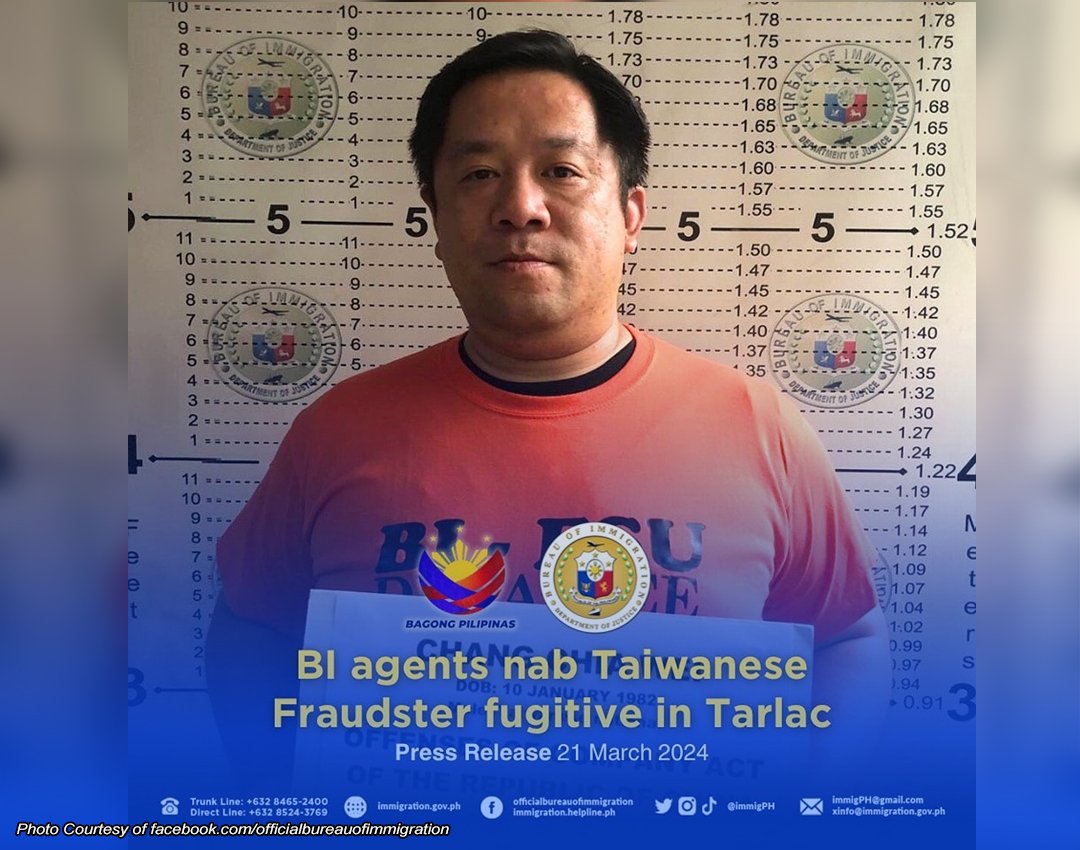 Ayon sa ulat kay Immigration Commissioner Norman Tansingco, ng BI’s Fugitive Search Unit (FSU), kinilala ang dayuhan na si Chang Chia Wei, 42, inaresto sa kanyang bahay sa Bamban, Tarlac, sa bisa ng warrant of arrest na inisyu ng BI Board of Commissioners noong