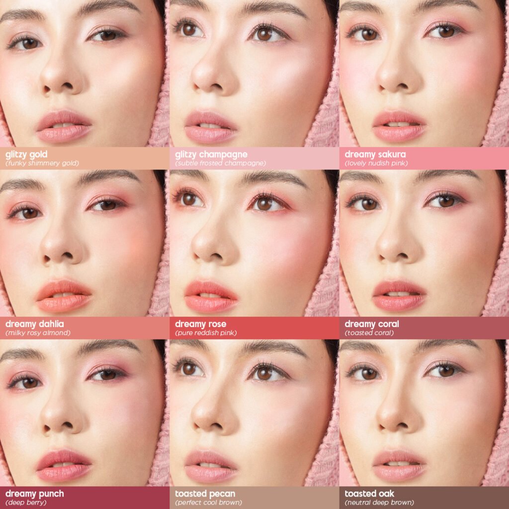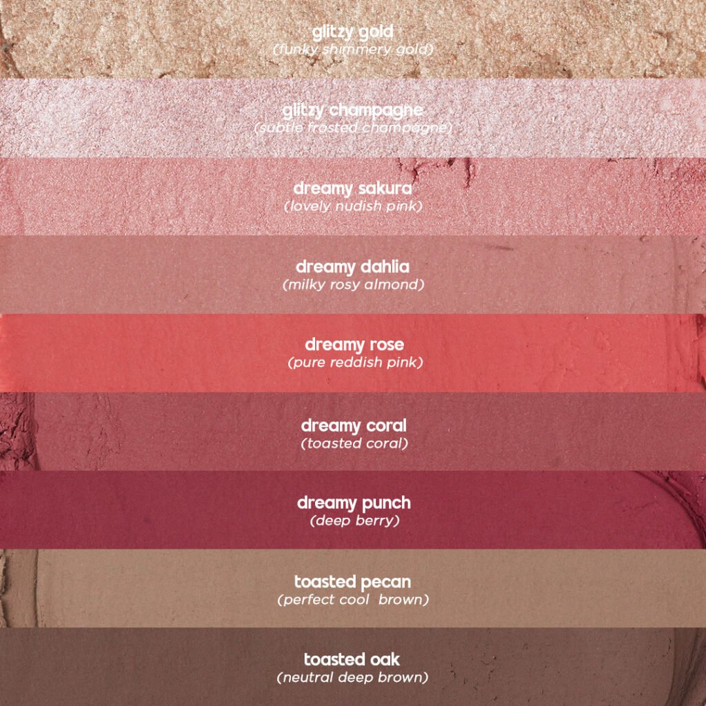 Ranging from shimmery hues that come in the shades Glitzy Gold (funky gold) and Glitzy Champagne (frosted champagne), to rosies such as Dreamy Sakura (nudish pink), Dreamy Dahlia (rosy almond), Dreamy Rose (reddish pink), and Dreamy Coral (toasted coral), to berries like Dreamy Punch (deep berry), and neutrals to accentuate your face shape, Toasted Pecan (cool brown) and Toasted Oak (deep neutral brown).