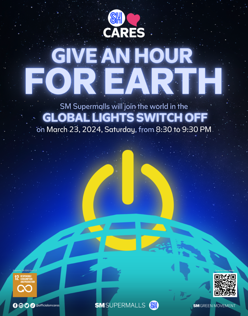Small actions can make a big difference. This year, SM Supermalls invites everyone to #GiveAnHourForEarth by joining millions around the world in the annual Global Lights Switch Off on March 23 from 8:30pm to 9:30pm. This 2024, SM marks 16 years of commitment in supporting the annual campaign initiated by the World Wildlife Fund (WWF) since its inception in the Philippines in 2008. You can make your mark too by participating in various eco-friendly activities across SM malls.