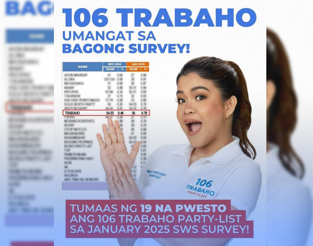 TUMAAS nang 19 na pwesto ang 106 Trabaho Party-List sa Stratbase-SWS January 2025 pre-election survey na inilabas ng Social Weather Stations noong Biyernes.