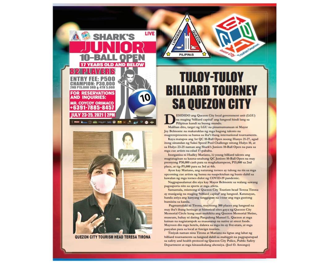 Samantala, mismong si Quezon City Tourism head Teresa Tirona ay masigasig na maging ‘billiard capital’ ang lungsod. Katunayan, handa aniya ang kanyang tanggapan na i-tour ang mga gustong