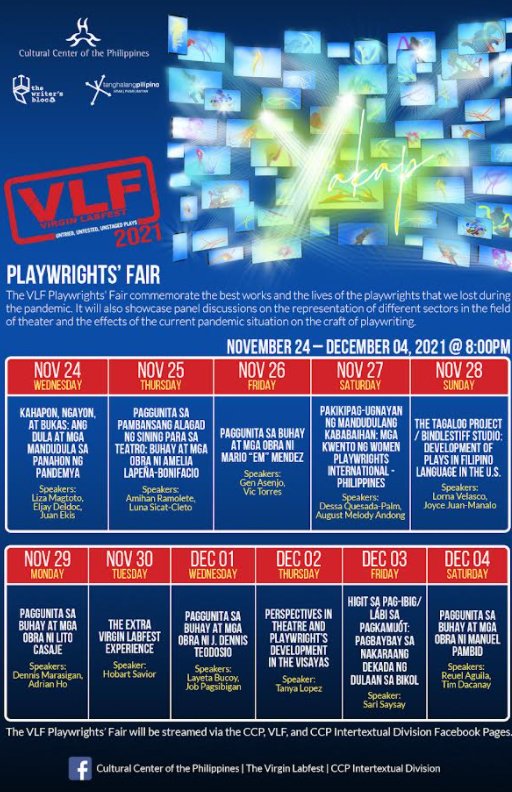 Ngayong taon, ang Virgin Labfest, na host ng Cultural Center of the Philippines, Writer’s Bloc at Tanghalang Pilipino, Virgin Labfest sa digital platform, ay muling tututuon sa edukasyon, na may mga bahagi ng festival sa FFF – Fair, Fellowship at Flashback. Ang festival ay may stream mula Nobyembre 24 hanggang Disyembre 5, 2021 sa CCP, VLF, at Tanghalang Pilipino Facebook Pages.