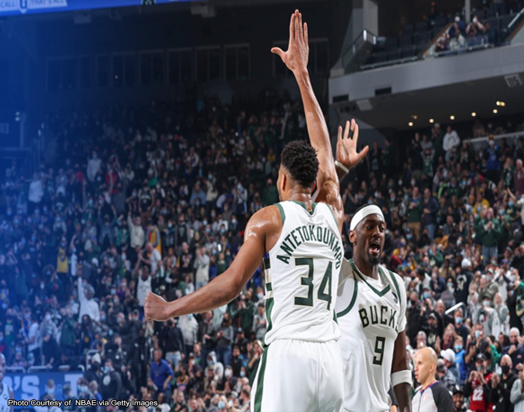 TINIYAK ni Giannis Antetokounmpo ang panalo ng Milwaukee laban sa bisitang Golden State Warriors sa pagbabalik ng Bucks coach na si Mike Budenholzer mula sa NBA’s COVID-19 protocols kahapon (Manila time).